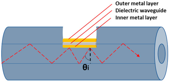 Surface plasmon resonance (SPR) is a well-known optical phenomenon that occurs on a metal-dielectric surface. When free electrons oscillate on the metal surface, the surface absorbs light energy and resonates during the reflection of light at the SPR angle, which has a major attenuation effect on reflected light, as shown in Figure 1 [1]. SPR is highly sensitive to the refractive index of the material in contact with the metal, which can be used as a sensing structure such as the Kretschmann Rather prism, optical waveguides, and optical fiber [2,3,4,5]. SPR is also used as an optical phenomenon to detect molecular interaction [6].