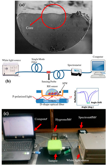The fabrication process of polishing SMF involves using an abrasive polishing wheel. This approach requires the SMF itself with a core/cladding diameter of 9/125 µm fixed on its position by utilizing a pair of fiber holders, where a small section of coating on SMF has been stripped off. The mechanical wheel was fastened by the abrasive paper in order to control the smoothness of the polished region. This process, which tends to have a success rate close to 100%, observably reduces the polishing time and provides a uniform polished active region. Here, the actual sensing region of the SMF was a 3-mm flat transition region, as shown in the image obtained by field emission scanning electron microscopy (FESEM) in Figure 2a. SMF cladding was removed, and the loss of the fiber was recorded as -2dB during the polishing process. A broadband light source with a range of 900 nm to 1500 nm and a spectrometer were used to measure the transmission attenuation of the SPF during the experiment. The polished portion of the flat surface was coated with 5-nm, 13-nm, and 36-nm thicknesses of Ti using an electron beam evaporation machine, followed by drop cast of MoS2 and WS2 layer of about 0.2 mL. A thin layer of Ti was deposited on flat-clad less optical fiber using an electron beam evaporation machine (EB43-T) at a high vacuum pressure of 10−5–10-7 Torr. Then, the sensitivity was recorded using a humidity sensor device with different relative humidity values (RH%). At the same time, the light of the polychromatic source was launched from one end of the fiber, and the other end of the fiber was connected to an ocean optic spectrometer. The output of the transmission spectra was recorded. A schematic diagram and a real image of the experimental set-up are shown in Figure 2b,c. The set-up for characterizing the resonance peak for TiO2/MoS2 and WS2 is shown in Figure 2b,c, in which one end of the fiber was coupled to a white light source, and the output was connected to AQ6370B Optical Spectrum Analyzer (Yokogawa Electric Corporation, Tokyo, Japan) with a spectral resolution of 2 nm with a range of 700 nm to 1800 nm.