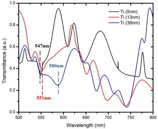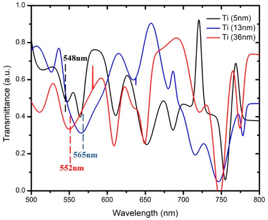 We observed that no significant shifting occurred at the fixed or constant range of wavelength for a thinner layer of Ti (Figure 5a,b). This indicates that the volume of 0.2 mL was not suitable with 5-nm and 13-nm thicknesses of Ti. In Figure 5c, the transmission dip for 36 nm of Ti layer shows a positive response to the 0.2 mL of MoS2 with an initial transmission wavelength of 565 nm shifting to the right to about 588 nm, which shows low frequency at a higher wavelength. The range of transmission response recorded was about 23 nm, where the 36-nm thickness of Ti was found to be suitable for use as a sensor with 0.2 mL of MoS2. The response of MoS2 to the different thicknesses of Ti is due to characteristics such as the thickness of adhesion on the surface of Ti, which is related to the roughness of the surface. For example, Ti has high corrosion resistance and a high-adhesion layer that forms a passivation surface when exposed to surrounding air. It has also been reported that the properties of the Ti layer do not change, and it is less absorptive compared to titanium alloys. Moreover, it is good in the phase of detection. In this case, the adhesion layer of Ti plays important roles in the composition of Ti/MoS2. MoS2 also has a low shear strength of its basal planes, with a friction coefficient as low as 0.01 in a vacuum environment. Furthermore, the coating of MoS2 has low resistance and can react with O and H2O in an atmosphere of high humidity to form MoO3 and H2SO4. Both of these compounds can lead to the corrosion of metal and degradation of coatings, and the low-adhesion layer of MoS2 is covered by the high adhesion layer of Ti. Based on the shift described for 36-nm thickness of Ti, the increased thickness of Ti provides an increased adhesion layer that reduces the rough surface of the Ti/MoS2 layer.