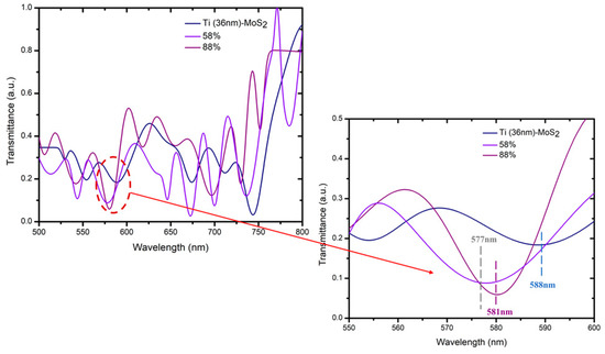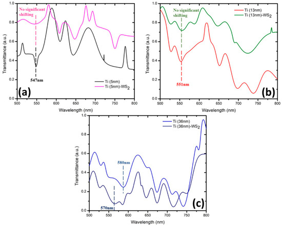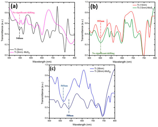 Figure 6 shows the same phenomena with MoS2, where we observed no shifting occurring at the fixed or constant range of wavelength. Both transmission dips at 570 nm and 580 nm do not give a response with a thinner layer of Ti. This indicates that the volume of 0.2 mL of WS2 is not enough to provide sensor properties to the Ti thickness shown in Figure 6a,b. In Figure 6c, the transmission dip for the 36-nm Ti layer showed a response to the 0.2 mL of tungsten disulfide (WS2), whereby the transmission dip at 580 nm shifted to the left to about 570 nm. The left shifting is known as blueshift where it has a higher frequency at a lower wavelength. The range of transmission response was large, about -15nm. The negative sign is functional, as the transmission wavelength is reduced. Due to the response of shifting, the 36-nm thickness of Ti appears suitable with 0.2 mL of WS2.