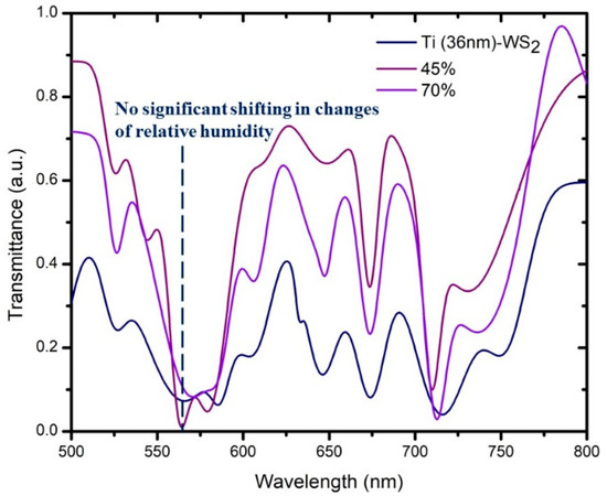In Figure 7 and Figure 8, we have simplified by selecting only 36-nm Ti due to its response when tested with MoS2 and WS2. Figure 7 shows that with MoS2, there was a change in the shift of the transmission dip when the relative humidity changed from 58% to 88%. The transmission dips for 58% and 88% of relative humidity were at wavelengths of 577 nm and 581 nm, respectively. Therefore, MoS2 appears to be highly sensitive toward 36-nm titanium in a constant range of transmission wavelength. The selection of the transmission dip in the humidity sensor was based on the similar shape of the transmission dip in the spectrum of Ti-MoS2 (36 nm) at 588 nm. Figure 8 shows the spectra with WS2 when the RH% changes from 45% to 70% as there is no shift of the transmission dip. Thus, it appears that WS2 was not as sensitive toward 36-nm titanium in the constant range of transmission wavelength even in higher RH%. The selection of transmission dip in the humidity sensor was based on the similar shape of the transmission dip for Ti-WS2. The sensitivity of the humidity sensor can be evaluated by the range of relative power based on the optical characteristics divided by the range of relative humidity (∆RP/∆RH) [16]. However, in this case, the sensitivity was determined by observing the response of shifting in the transmission dip. Therefore, compared with WS2, MoS2 was more sensitive when reacting with titanium.