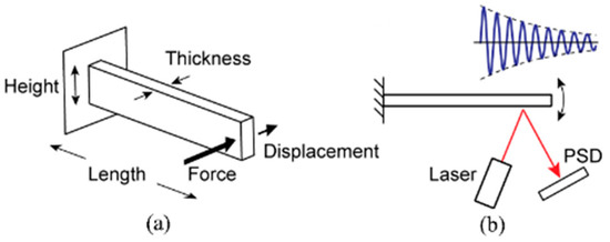 The dynamic parameters of the nylon material were also measured. We employed a laser that cast a beam onto a reflective piece of aluminum adhered to a secured cantilever; this setup can be seen in Figure 1b. The reflected beam from the aluminum was received by a photodiode position detector (Hamamatsu S5990). When the cantilever was bent, the laser reflection was altered, and thus the reflection on the photodiode was altered, resulting in a change in current. A thin piece of aluminum foil was mounted onto each of the 18 cantilevers using a sticky wax material. The change in weight due to the aluminum strip and the wax material was measured for each cantilever and considered as an additional mass to the effective mass when considering the resonant frequency: