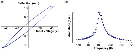 Characteristics of the piezoelectric bimorph actuator. (a) The applied voltage to the piezoplate versus the piezoplate deflection. Typical non-linear characteristic of piezoelectric material was quantified. (b) The frequency response of the piezo actuator given an initial input frequency and measuring the corresponding output amplitude. The dotted line is the curve fit to the theoretical frequency response of a damped harmonic oscillator. This graph allowed for the calculation of resonant frequency (), effective mass (), Q factor (), and damping coefficient ().