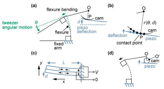 Figure 3 shows the principle of the displacement transmission mechanism we developed for the tweezers. The moving arm of the tweezers is supported by a flexure and moved by a piezo bimorph actuator. A cam is designed to linearly transfer the deflection (d) of the actuator to the angular displacement (θ) of the flexure. As shown in Figure 3a,b, the curve of the cam is given as the path, which the tangent point P traces as d and θ increase. In this theoretical model, the contact point moves by pure rolling without sliding, minimizing the friction between the cam and the actuator. For each combination of d and θ, the cam-piezo contacting point, P, is given as the closest point on the piezo to the point O, which is a fixed point within the cam (Figure 3b). The vector is given as a function of d and θ: