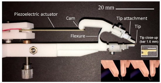 We showed the design of an actuation mechanism based on a 3D printed flexure and a piezo bimorph actuator. The elastic modulus and the density of the 3D printed nylon were first determined by studying sets of simple cantilevers. The finite element method (FEM) analysis of the tweezers on COMSOL™ based on the obtained fundamental data matched well with the measurement. The angular displacement of the moving arm showed a good linearity (R2 = 0.9991) with the linearity error of 0.1 degrees within the actuator deflection (0–1.74 mm), showing the efficacy of the 3D printed cam. We already utilized this manipulation systems in many successful applications we reported elsewhere [22,23,24]. In these previous studies, we used the tweezers for relative positioning with incremental tip displacement. The smallest positioning step was defined by the resolution of the voltage step sent from the controller, and the typical minimum operational step was ~1.7 μm/step at a voltage application of 0.35 V/step. In this paper, we described the detailed design principle and the material and the dynamic characteristics of the manipulation system. Our microtweezer design is a low-cost, efficient method of the direct assembly method of micro/meso-scale biosamples.