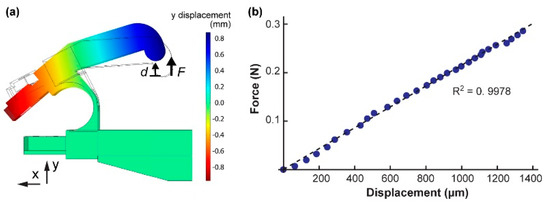Once fundamental material properties are found, characteristics of an arbitrarily designed part can be found from a finite element method (FEM) analysis. (a) COMSOL® analysis of the tweezer flexure. The image displays the cam with an applied force of 0.2 N. (b) Experimentally measured tweezer flexure force vs. displacement curve.