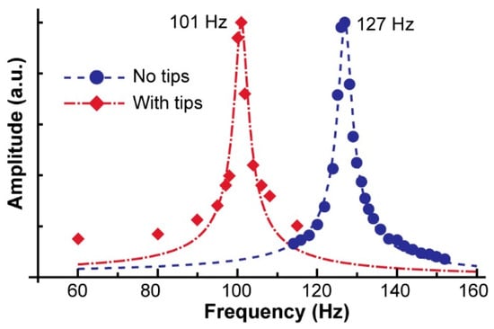 The resonant frequency () of the piezoplate was measured to be 189 Hz. With the resonant frequency and the spring constant of the actuator, Equation (6) was used to find the effective mass of the piezoplate ().