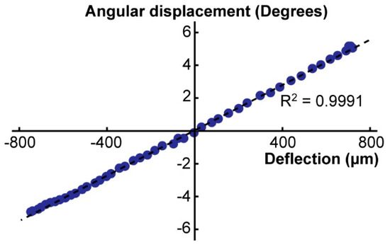 In addition to the frequency characterization, we demonstrated that the actuation mechanism of the cam and the flexure linearly transferred the piezo deflection to the angular displacement of the tweezer tips within the full operational range of the actuator. The result is shown in Figure 8. The root-mean-square error from the linear fit was 0.1°.