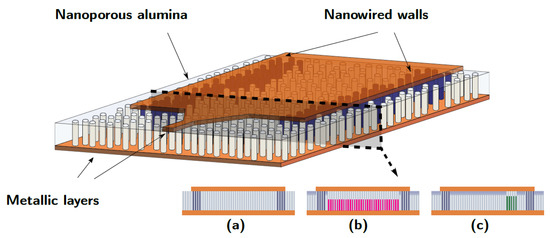 A schematic of the porous template supporting the Nanowired Substrate Integrated Waveguide is shown in Figure 1. Some regions contain electrodeposited nanowire arrays loaded inside the alumina template. The procedure of electrodepositon is briefly described in Section 3.2. It allows a fine control of the height of deposited nanowires (NWs), while their diameter is fixed by the pore diameter of the membrane, as shown in Section 3.1.