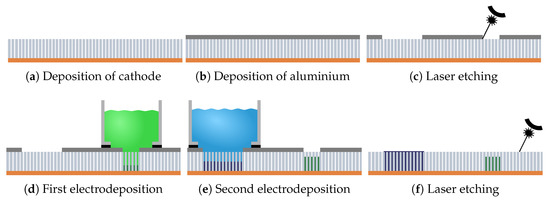 After laser etching, the nanowires growth by ECD takes only place in the pores that have not been damaged by laser beam. It allows then a precise control of their positioning. Different materials can be deposited inside the same template using several ECD steps. The height of the nanowires can also be controlled by the deposition time to meet the needs. In contrast to the former LES method, the ECD in the LEP process may be continued after overfilling of the pores. As a result, the order in which the ECD steps are conducted to create the example pattern reported in Figure 3 can be inverted. Finally, as in Section 2.3.1, RF patterns are laser-etched in the top metallic layer.