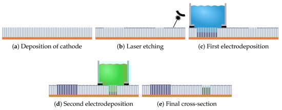 Laser process based on the Etching of the template surface Porosity (LEP), for a device including two materials of different heights. (a) E-beam deposition of Copper cathode. (b) Localised laser destruction of porosity on the top face. (c) ECD of first material until overflowing. (d) ECD of second material until a partial height in unclogged pores. Unlike the LES method, the order of the ECD can be inverted. (e) Final cross-section of the AAO membrane.