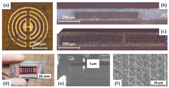 In Figure 4, several images of results obtained with the LEP process are presented. In Figure 4a, an example of interdigitated electrodes (IDE) pattern after etching but before ECD is given. The etched part is darker while the bright color indicates the un-attacked pores ready for ECD. This shows an example of complex pattern of grown nanowires that can be created. Figure 4b,c are two optical microscope (OM) images of cross section of a 70% filled and a 100% filled membranes. We see the sharp transition between filled (black) and unfilled (blue) regions and the uniform filling along the whole cross-section. A CCD photograph of a microwave device (substrate integrated waveguide (SIW) with a EBG filter effect) is given Figure 4d. The darker areas are filled with nanowires. The width between the walls of the waveguide (i.e., the two long nanowired rows) is 6 mm. Six rectangular nanowired areas are posted in the guide in order to create an Electromagnetic Band Gap effect similar to Reference [5]. Finally, the two SEM images in Figure 4e,f give a view of the surface after the etching: the surface porosity is completely destroyed.