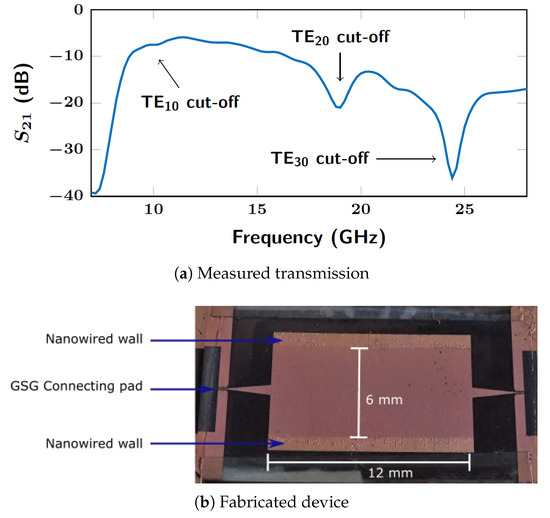 The measured transmission S through the empty NSIW (Figure 1a) is shown in Figure 5. The measurement method is described in Section 3.4. Shielding walls are made with Cu nanowires, the waveguide cavity size is 6 × 12 mm. The cut-offs of the 3 first modes TE, TE and TE appear at the values predicted by the theory (1): 8.5 GHz, 17 GHz and 25 GHz.