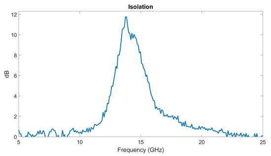 An NSIW isolator was also designed and fabricated using the LEP process in Section 2.3.2, and measured. The cavity is 6 mm-wide and 20 mm-long. A 10 mm-long and 1.5 mm-large area of ferromagnetic NiFe nanowire arrays was grown inside the cavity (see Figure 1c) at the transversal position given by (5), = 1.6 mm. The relative height of nanowires is 70%. We used saturation magnetization = 1000 kAm, remanence factor m = 0.8, the gyromagnetic factor × sAkg and relaxation time = 7 × 10 s. The ferromagnetic nanowired-filled area inside the waveguide is 10 × 1.5 mm = 15 mm. The difference between the forward S and backward S transmissions, i.e., the isolation, is shown on Figure 6. A maximum occurs at 13 GHz, which is induced by the ferromagnetic resonance of NiFe material, and is the signature of a nonreciprocal propagation through the device, since S and S are significantly different (12 dB).