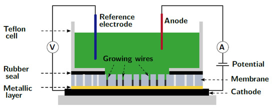 Schematic illustration of the electrodeposition cell using the three-electrodes configuration (i.e., three-layered cathode, Pt anode and AgCl reference). The membrane is covered by the Teflon cell containing the electrolyte, over an area where the pores are opened. A piece of rubber is inserted for ensuring the sealing. Adapted from Reference [39].