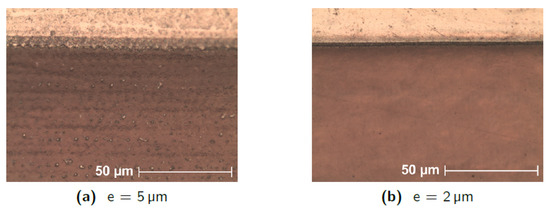 where v is the speed of the spot and is the pulse repetition frequency. The distance e is set first. Considering that the diameter of the laser spot is 10 m and that an overlap is necessary to ensure a correct ablation of the aluminium, we start by imposing e = 5 m. Several tests performed with this value have shown that, for a thickness of 1000 nm, the induced overlap is not sufficient (see Figure 9a). Indeed, as the passes go by, the lines on which the spot center pass are more intensely engraved than the areas between these lines. This result is due to two effects: the inaccuracy of the laser spot longitudinal position on the one hand, and the non-homogeneity of the laser power on the spot surface on the other hand. The power in the laser beam follows a Gaussian distribution. In order to increase the recovery and reduce the impact of these two factors, the value of 2 m was chosen for e. This provides better homogeneity in the etching (see Figure 9b and Figure 10). Experience shows that if the laser spot moves too fast, the definition of the followed path is not accurate, especially around corners and half-turns. This definition comes acceptable when the speed approaches 300 mm/s. We chose 200 mm/s, which is a commonly used value. Hence, according to Equation (8), the frequency must be 100 kHz.