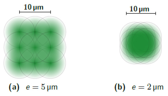 Schematic distribution of laser power on two illuminated areas with two values of e, the distance between spots. The intensity in the spot respects a Gaussian distribution. By decreasing e, the overlap and the homogeneity of the etching are increased but the etched surface is reduced.