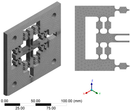 - In the process of meshing the model, the results of finite element analysis are not ideal if the mesh is too sparse or too dense. Too sparse mesh will lead to low accuracy and inaccurate modeling result. If the mesh is too dense, the operation time will be increased and affect the work efficiency. Due to the complexity of the flexure hinge mechanism, Tetrahedrons meshing method and Patch Conforming algorithm were selected to mesh the model with which the meshes can be generated quickly and automatically. Furthermore, Tetrahedrons meshing method will be applicable to a variety of complex geometric shapes; Proximity and Curvature can be used in the key areas to refine the mesh automatically. Finally, the model was divided into 519,284 elements containing 792,475 nodes.