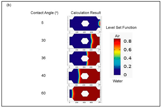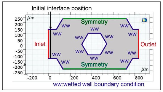 Figure 3 shows the details of the model geometry. The inlet and outlet boundary conditions were set to zero pressure for spontaneous flow condition. The symmetry boundary condition was selected for the top and bottom walls, effectively modelling an infinite 2D expansion of the repeating pattern. The wetted wall boundary conditions in the Multiphysics interface provide user set contact angles. The contact angle range between 5 and 60 degrees was studied.