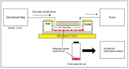 The device was loaded with fresh capture liquid. The inlet and outlet ports for liquid were sealed with Kapton tape. The gas sampling was performed as illustrated in