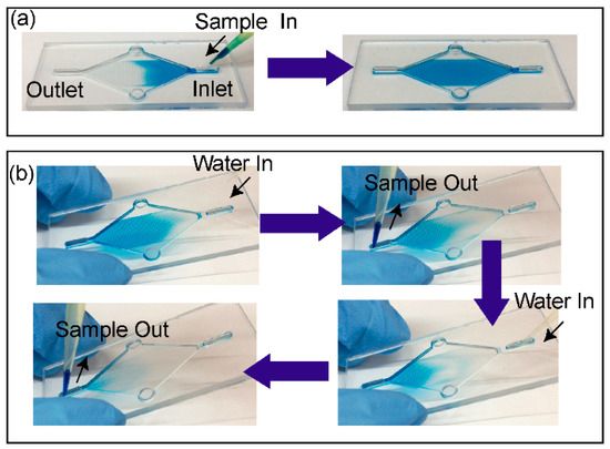 As the device is based on capillary flow, stable operation relies on maintaining the water wettability of the open channel surface. The wettability of the borosilicate glass surface was achieved by cleaning the surface in aqueous NaOH solution (100 mg·mL−1) to generate OH groups on the glass surface. This cleaning procedure was used whenever surface wettability needed to be restored. The fabricated device was immersed in the solution overnight while making sure the surface of the open channel was completely covered by solution without residual bubbles. The device was rinsed with Milli-Q water to wash out remaining NaOH. Surface wettability was confirmed by priming the device with food colouring solution and observing liquid spreading in the open-channel network. For long term storage, the surface was wetted with Milli-Q water and all the ports on the device were sealed with Kapton tape to prevent evaporation and surface drying.