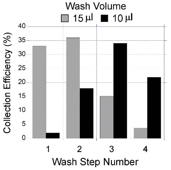 To quantify the capture liquid collection efficiency, a water soluble fluorescent stain was used as a marker. A calcein (CAS 1461-15-10) stock solution was prepared in water to a concentration of 78 µM, filtered through a 0.22 µm pore size PTFE syringe membrane filter. This solution was loaded to the device and collected to measure the amount of calcein. The plate reader (Enspire 2300 multilabel reader, Perkin Elmer, Waltham, MA, USA) was used to measure fluorescence emission from liquid samples collected from the device. For 96-well plate measurements, the 30 µL collected volume was increased to 100 µL by adding 70 µL of water. The measured emission from the well was converted to calcein amount (moles) by using the calibration curves generated with the standard samples.