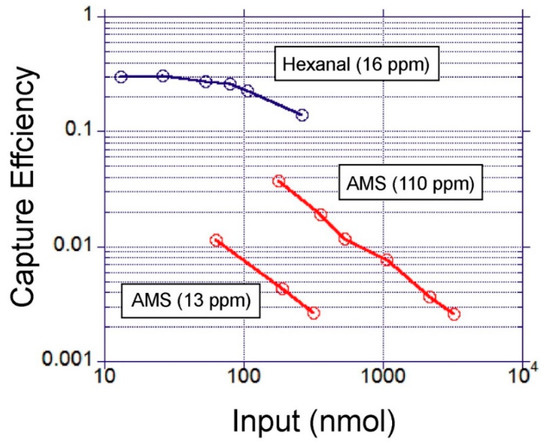 Table 1 shows the selected volatiles and their properties. The two model volatiles with distinct physicochemical properties were selected to assess the impact of compound lipophilicity on the gas-liquid extraction efficiency. Hexanal and allyl methyl sulfide are also known as breath biomarkers for lung cancer and malaria, respectively.