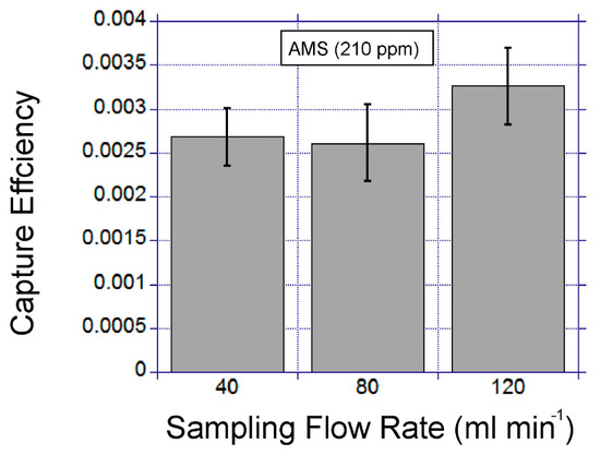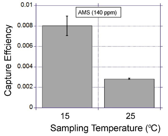 Figure 5. The device was placed on a copper plate attached to a thermo-electric cooler with a control unit (PLC-24V6A, Kurag Electronics, Tokyo, Japan) which allowed temperature adjustment between 15 °C and 40 °C. The diffusion pump oil (Santovac 5, Santovac fluids, Spartanburg, SC, USA) was used between the copper plate and the device to ensure efficient thermal contact. The gas inlet port on the device was connected to the gas sample bag and the gas outlet was connected to a miniature air pump (SKC Inc., 210-1002A). The pump provided negative pressure to the gas outlet of the device to pull the gas from the sample bag in to the device at a controlled flow rate (40–200 mL min