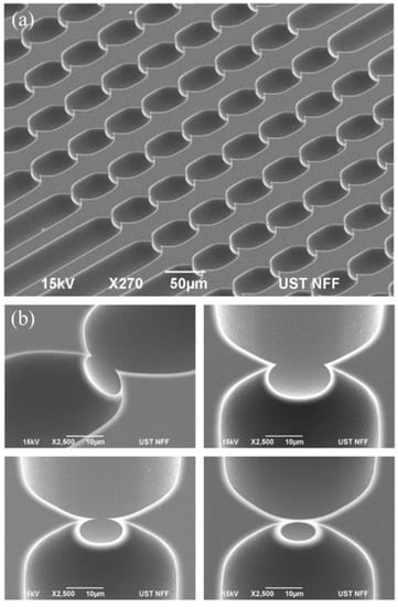 Scanning electron micrographs: (a) channels featuring eight single-cell point constrictions and (b) constrictions of various sizes in close-up views. Scale bar: (a) 50 μm; (b) 10 μm.