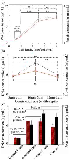 Figure 3b,c show the influence of the constriction size, as well as the constriction count per channel, respectively. A slight deviation in size, whether that be an increase ( μm, μm) or a decrease ( μm, μm), leads to a concentration drop in both the total protein and DNA level; however, the drop in DNA on average (from 7 to ~5 μg/mL) is statistically insignificant and less noticeable than that in the protein (from 1.6 to ~1 mg/mL) for both the constriction sizes. Through the large constriction, cells continue to deform, but probably not to the extent that can instigate their effective disruption, whereas through the small constriction, they display clogging, which limits the elution of DNA and proteins.