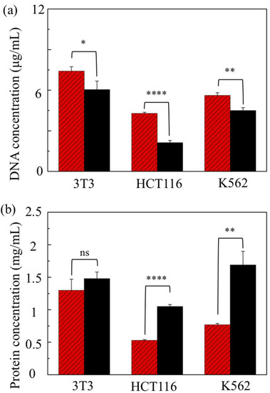 Previous studies on the topic have reported the concentration values for total nucleic acids, including dsDNA, ssDNA, and RNA, based on the absorbance readings at 260 nm [21,23,24]. Although this method was initially adopted here for convenience, it was found to be unreliably inaccurate and was abandoned for a fluorometric method, which is known to be more sensitive and accurate and highly specific to dsDNA [34]. Similarly, the total protein levels were measured here using a colorimetric assay (BCA) instead of absorbance levels measured at 260 and 280 nm (Warburg Christian method) [35]. While the absorbance spectrophotometry is an established technique for the rapid evaluation of protein and nucleic acid levels, its accuracy highly depends on the sample purity [36]. Pure or nearly pure samples of nucleic acids or proteins can be accurately measured contrary to their complex mixtures, which, however, reportedly give inaccurate readings [37,38,39].