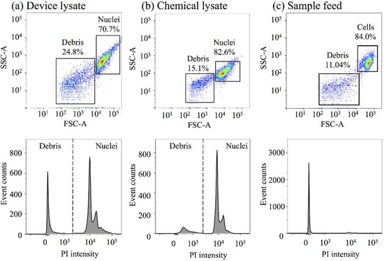 Representative scatter plots of forward-scattered (FSC) and side-scattered (SSC) data and the corresponding histograms of propidium iodide (PI) intensity from (a) a device lysate (from a four-constriction treatment) and (b) a chemical lysate, as well as (c) the sample feed (untreated cells). The constrictions are μm and μm.