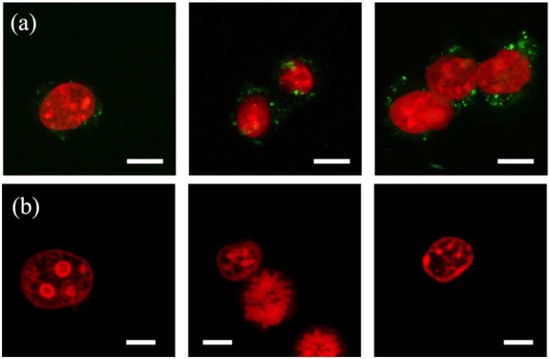 Confocal fluorescence images of the nuclei (red; propidium iodide (PI)-stained) from mouse embryo fibroblast (NIH/3T3) cells isolated using (a) an eight-constriction treatment and (b) chemical lysis. The nucleus, and the nuclear doublet and triplet shown in (a) carry membrane fragments (green; DiOC18(3) (DiO)-stained). The constrictions are μm and μm. Scale bars are 10 μm.