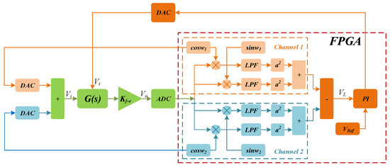 where represents the cut-off frequency of low pass filter (LPF), and K and C are the integral coefficient and reference voltage of PI controller, respectively. To analyze the transient properties of the closed-loop control system, we assume the input of system (V) as and = wt. Then, the output of preamplifier (V) and its derivative can be expressed as