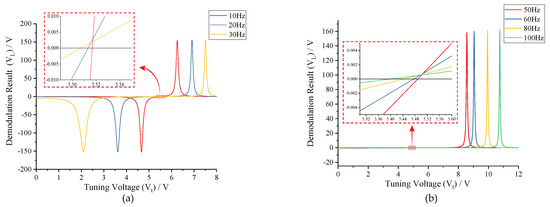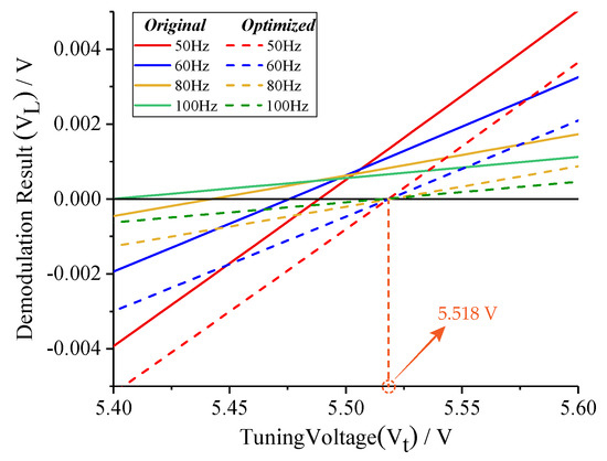 According to Equation (9), we optimize the two-side excitation signal under the condition of f > f − f. The comparison of demodulation results (V) before and after optimizing is shown in Figure 6. Different from demodulation results (V) without optimizing, new relationship curves perfectly converge at the theoretic point. Therefore, the tuning error can be effectively eliminated, and the effectiveness of amplitude optimizing is validated.