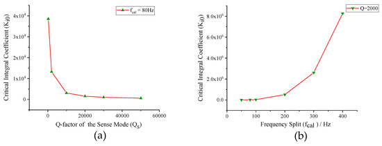 The relationship curves between the critical integral coefficient and key parameters of mode-matching system: (a) frequency split; and (b) Q-factor of the sense mode.