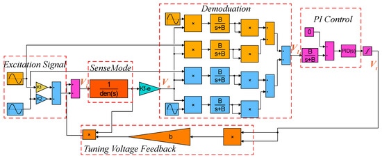 The block diagram of digital excitation-calibration control system for the closed-loop mode-matching is shown in Figure 3, where V is the two-side excitation signal and V = + , G(s) represents the sense-mode dynamics of the MEMS gyroscope and K is preamplifier gain. The output of preamplifier (V) contains the amplitude response information of two-side excitation signal. The demodulation result (V) of V is fed into proportional integral (PI) controller to generate the DC tuning voltage (V). Feedback of V to sense dynamics contributes to building the closed control loop with the ability of automatic mode-matching.