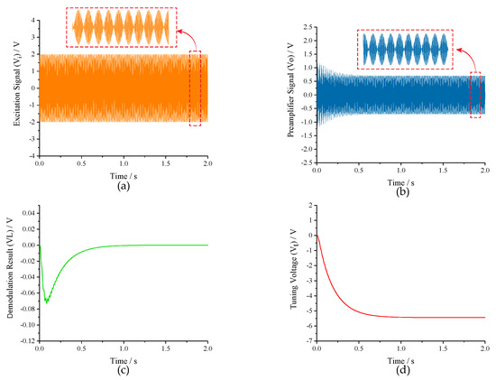The transient responses of the closed-loop excitation-calibration control system: (a) excitation signal; (b) preamplifier signal; (c) demodulation result; and (d) tuning voltage.