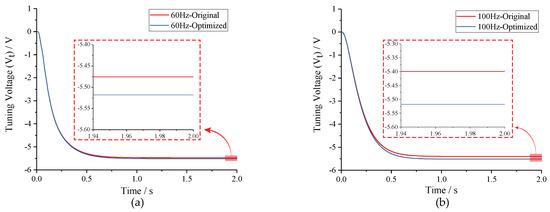 To test the optimization effect of Equation (9), the amplitude ratio of two-side excitation signal was set to 1:1 and (2f − f):(2f + f), respectively, under conditions of f = 60 Hz and f = 100 Hz. Simulation results in Figure 12 indicate that the tuning voltages can be adjusted to the theoretic value by amplitude optimizing regardless of the tuning accuracy before optimizing.