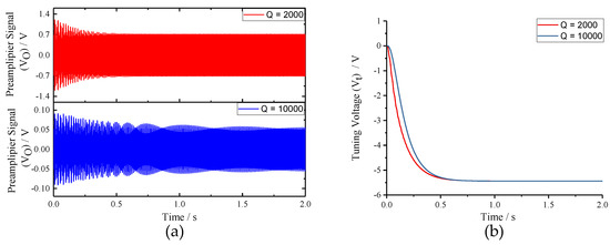 To verify the impacts of sense-mode Q-factor (Q) on the mode-matching system, Q was assigned to 2000 and 10,000, respectively, under the condition of f = 60 Hz. Waveforms of key signals in the closed-loop excitation-calibration control system are presented in Figure 13. Figure 13b reveals that the final tuning voltages under Q = 2000 and Q = 10,000 conditions are basically equivalent, which coincides with the open-loop analysis. However, when Q = 10,000, the output of preamplifier (V) is excessively weak, which makes it rather hard to detect with the available performance of practical circuit. Meanwhile, to shorten the tuning time, the integral coefficient (K) needs to be improved, which will lead to the enhancement of system instability according to the closed-loop analysis above. Therefore, it can be concluded that the work interval of the integral coefficient (K) will be very narrow when sense-mode Q-factor (Q) is high.