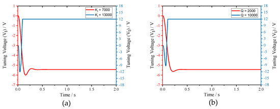 Stability tests of the excitation-calibration control system: (a) tuning voltages with the same Q, f and different K; and (b) tuning voltages with the same K, f and different Q.