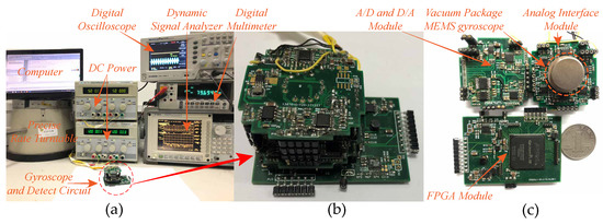 A series of experiments was carried out to verify the theoretic analysis and simulation. Figure 15 shows the experimental platform in laboratory environment. The involved experimental facilities contain two DC powers, a digital multimeter, a digital oscilloscope, a computer, a precise rate tunable and a dynamic signal analyzer, as shown in Figure 15a. The assembled control circuits used for system control and signals detection are presented in Figure 15b. Three sub-modules of the control circuits are the analog interface module, the A/D and D/A module and the FPGA module, which are illustrated in Figure 15c. The entire control system consists of four closed loops: self-excitation drive loop, force feedback control loop, quadrature error correction loop and the excitation-calibration control loop. All the control algorithms are implemented in the FPGA chip. To ensure enough logical source, we adopted the EP3C55F484I7 chip from the Altera corporation, which contains 55,850 programmable logical units, 239,600 RAM bits and 156 multipliers. The DAC is CS4344 chip from CURRUS corporation and ADC is AD7767 chip from ADI corporation. Both sampling rates were set to 48 kHz to ensure enough working rate of the entire control system.