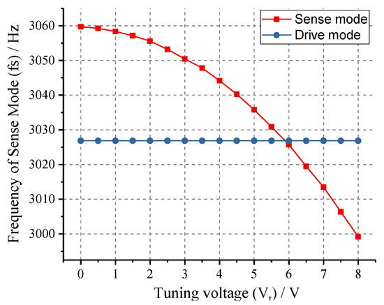 According to the electrostatic negative stiffness effect, when the DC tuning voltage V is applied on the frequency tuning electrodes of MEMS gyroscope, the sense-mode resonance frequency can be simplified as