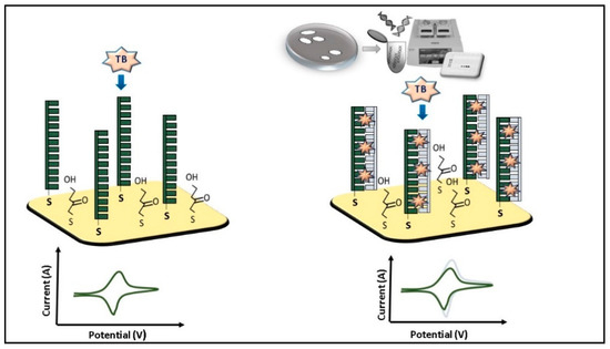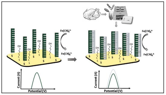 More studies on the detection of L. monocytogenes by electrochemical biosensors were published compared to those on detection of Campylobacter. DNA sensors have attracted the attention for the advantages of being cheap, rapid, and highly selective. Gao et al. [42] developed an electrochemical biosensor composed of a DNA probe that recognized the gene actA. The gene actA encodes for a L. monocytogenes surface protein actine assembly-inducing (ActA) that enables bacterial cells to propel through mammalian cells upon infection. The Au electrode was dipped in a mercaptoacetic acid solution to form self-assembled layer activated with a mix of N-(3-dimethylaminopropyl)-N′-ethylcarbodiimide hydrochloride (EDC) and N-hydroxysuccinimide (NHS). The DNA probe (bioreceptor) was immobilized on the electrode surface via amino links (Figure 2). Toluidine blue (TB) was used as an electrochemical indicator because it is able to discriminate ssDNA (DNA probe) from dsDNA as it intercalates double strands, but not single strands. The concentration range tested was from 1 × 10−7 to 8 × 10−5 mol·L−1. An increment of the anionic peak intensity proportional to the concentration of hybridized DNA target was observed.