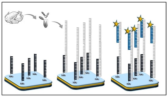 The majority of optical sensors for Campylobacter detection are genosensors that employ different DNA probes. Manzano et al. [48] used an organic light emission diode (OLED) to detect Campylobacter spp. in poultry meat samples. A specific DNA probe modified with an amino group at 5’ was used as a capture element and a DNA probe labelled with Alexa Fluor® 430 (Thermo Fisher Scientific, Waltham, MA, USA) was used as a detection probe (Figure 3). The biosensor targeted a specific DNA sequence for the 16S rRNA gene of Campylobacter spp. The OLED produced a specific emission spectrum for the excitation of the Alexa Fluor® 430 molecule upon target detection. The biosensor was validated with classical and molecular methods to confirm sensitivity and specificity. The system showed a good linear correlation in the tested range of concentrations with an R2 of 0.99 and a sensitivity of 0.37 ng·µL−1 DNA indicating a suitable utilization for real sample analysis. In addition, no cross-reactivity was observed using genomic DNA extracted from non-related microorganisms.