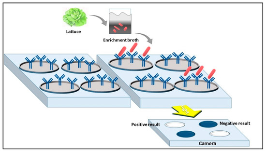 Morlay et al. [54] developed a label-free system based on SPR imaging (SPRi) coupled with an immunosensor specific for L. monocytogenes detection. A biochip with a gold surface was functionalized with seven different polyclonal antibodies. BSA solution was used as a blocking agent to avoid nonspecific binding. During the analysis, the SPRi signal of the biochip was monitored in real time during the injection of various bacterial concentrations. The antibody successfully bound bacterial cells in both pure culture and lettuce samples inoculated with three L. monocytogenes strains (from 17 to 25 CFU·g−1) (Figure 4). No cross-reactivity was observed using non-related bacteria. The proposed method permitted the detection of L. monocytogenes in 30 min but demanded 24 h enrichment step prior to analysis.