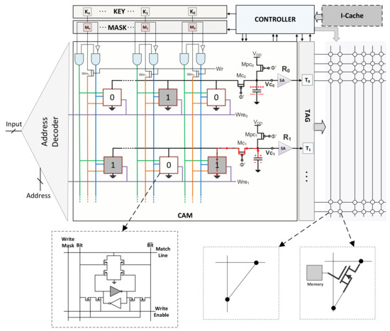 Figure 1 shows the overall architecture of an AP in detail. The key component of an AP is a content addressable memory (CAM) [26,27]. A CAM is used to access the data by its content on the contrary to the traditional memory where the data is accessed by its address. The CAM stores the data on which the operations are performed. The figure shows the SRAM-based CAM cell structure. In this cell, the one-bit data is stored by a coupled inverter where each inverter supports to the other to keep its logical value. Associative processing exploits the associativity feature of the CAMs hence the name comes from. The basic operation on a CAM is done through the key, mask, and tag registers which are managed by the controller. A search operation inside the CAM can be performed as follows; First, the content which searched for inside the CAM is written to the key. The mask register identifies the columns on which the search is performed. If the content is found in a row, the corresponding tag register of this row becomes logic-1.