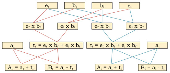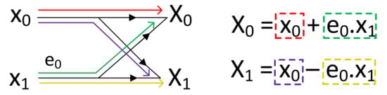 The butterfly operation is the fundamental building block of an FFT stage. Figure 2 shows the simplest butterfly diagram consisting of two inputs, two outputs and one exponential coefficient (twiddle factor) where all numbers are complex (i.e., ).
