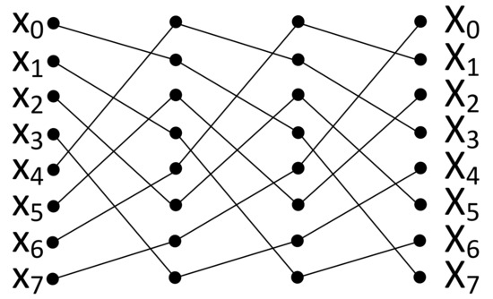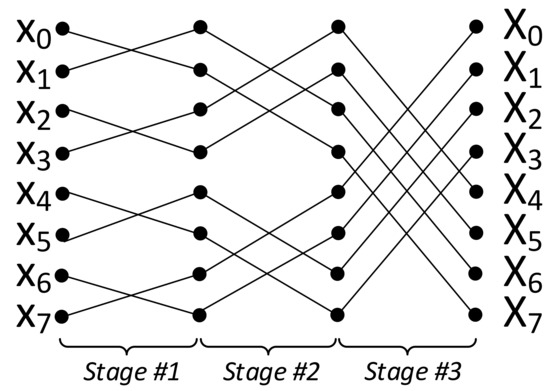 There are many algorithmic implementation of FFT (e.g., prime-factor FFT [37], Krukar’s FFT [38], and Bluestein’s FFT [39]) where some of them are optimized for specific input types (e.g., prime sizes, powers of two). Singleton’s FFT [40] is an approach for performing FFT in the same manner and operational complexity as Cooley-Tukey FFT in traditional computers. On the other hand, it provides an incomparable advantage for APs. Even though the traditional FFT requires the change in the communication pattern where each FFT stage requires different input pairs, Singleton’s FFT fixes the pattern of the data flow between the butterfly stages. For the visualization, Figure 6 shows an 8-point FFT using Singleton’s method where the input of every step goes into butterfly with input where n is the FFT size. Even though variable computation pattern is not an issue for general-purpose processors or ASICs which always have a random-access memory structure, it provides a vital advantage for parallel in-memory processing systems detailed as follows.