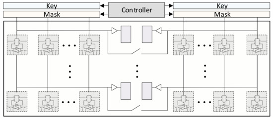 For the in-memory FFT processors, two different architectures are proposed which are throughput and area-optimized, respectively. The throughput-optimized architecture performs each stage of the FFT in an AP-CAM as shown in Figure 4. The communication patterns between the APs can be fixed since the FFT size is fixed to 1024-point and it is known as a priori. On the other hand, the communication pattern varies with respect to the current stage as seen in Figure 3. Even though this architecture provides high-throughput in-memory FFT, it needs to replacement of AP-CAMs 10 times (i.e., ). An area-efficient alternative can be possible through the reconfigurable switching matrix where the results of a single AP stage are feedbacked back to the AP itself (see Figure 5). After completion of a butterfly stage, the reconfigurable switching matrix can be configured according to the next stage. However, this approach requires additional area and control costs. If the number of rows of a CAM array (n) is more than the number of columns (m) in an AP which is generally so since parallelism is obtained as row-wise, the area complexity of a reconfigurable switching matrix () becomes more than CAM itself (). For instance, to perform a 1024-point FFT on 12-bit data, 132 × 512-bit CAM array is required. On the other hand, it requires a 512 × 512-bit reconfigurable switching matrix. Even the CAM cell size is assumed as 2× of the traditional memory, the switching matrix requires about 1.94× more area. Furthermore, the control over the switching matrix becomes intractable also since every cell must be controlled individually.